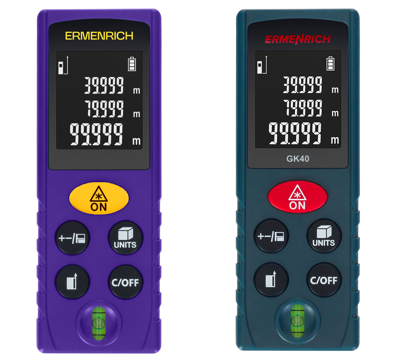 El medidor láser Ermenrich Reel PLUS GK40 se utiliza para muchas tareas de construcción, reparación, ingeniería o domésticas. Le permite hacer mediciones precisas dentro de un radio de 40 metros y calcular volúmenes y el áreas. Para hacer mediciones en condiciones difíciles, cuando no es posible colocar el medidor en la posición deseada, puede usar el teorema de Pitágoras para calcular la distancia al punto deseado a partir de mediciones indirectas. El dispositivo también tiene un nivel de burbuja, que se puede utilizar para instalar el medidor con precisión y como herramienta independiente.