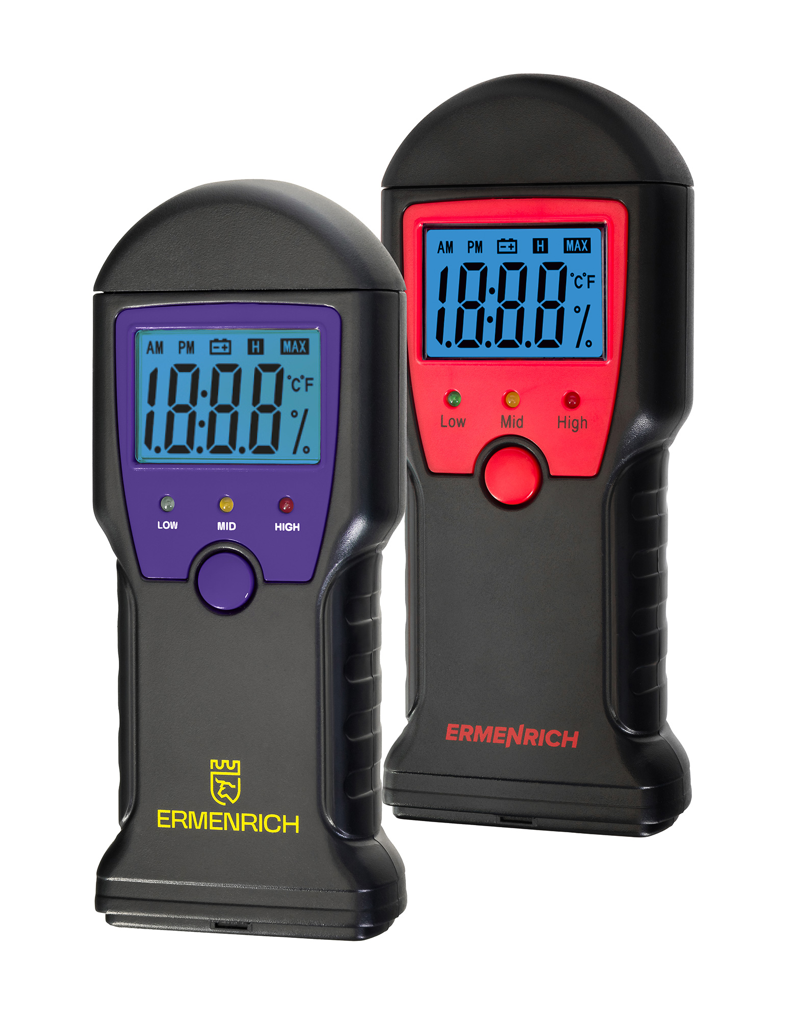 El dispositivo Ermenrich Wett MW10 es un detector de humedad con agujas para determinar el contenido de humedad de la madera, mezclas para la construcción y morteros. El dispositivo también puede medir la temperatura en grados Celsius o Fahrenheit. Control sencillo con un solo botón. Las mediciones se muestran en la pantalla integrada con dígitos grandes y una iluminación de fondo brillante de color azul. Debajo de la pantalla, tres indicadores LED proporcionan una indicación general del nivel de humedad existente en el material: verde significa humedad baja, amarillo significa humedad media y rojo significa humedad alta.