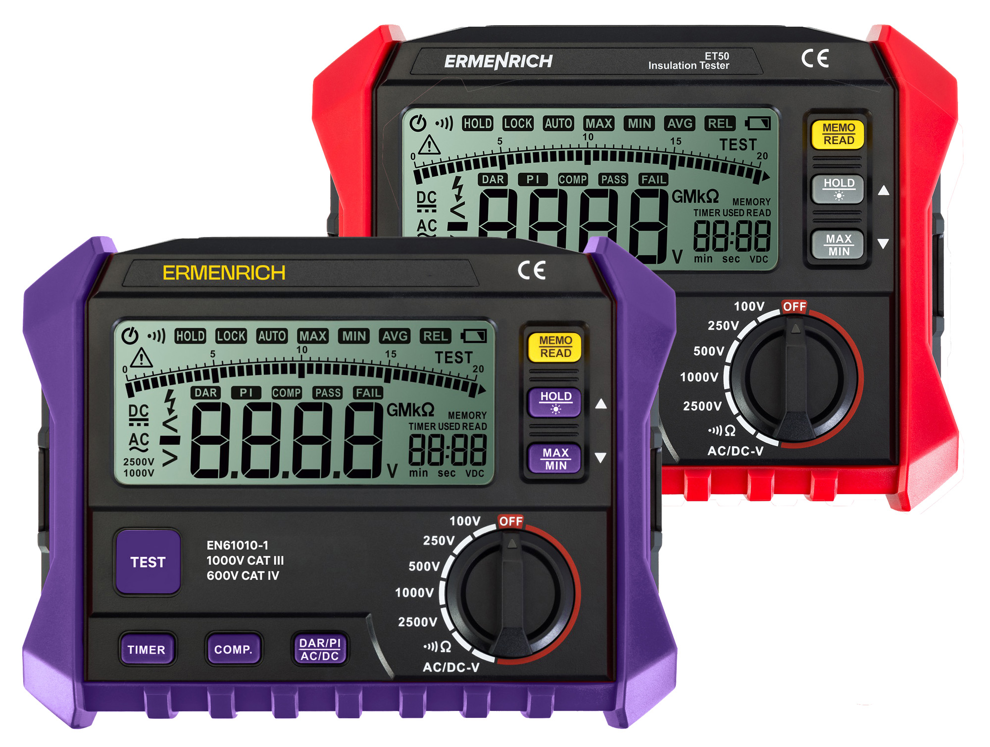Ermenrich Ping ET50 es un comprobador de resistencia de aislamiento, o megóhmetro, que se utiliza para comprobar la calidad de los cables. El daño o deterioro del aislamiento de un cable con voltaje puede provocar cortocircuitos e incendios. La inspección periódica con un megóhmetro reduce el riesgo de que se produzcan situaciones tan peligrosas. El dispositivo funciona con 5 voltajes de prueba: 100, 250, 500, 1000 y 2500 V. El rango total de medición de resistencia es de 0 a 200 GΩ.