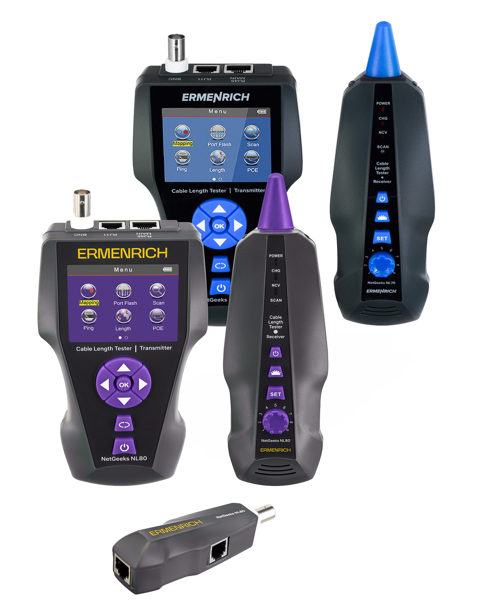 El comprobador de longitud de cables Ermenrich NetGeeks NL80 puede medir longitudes de cables de hasta 1000 metros y también tiene otras funciones. Puede comprobar cables en busca de circuitos abiertos y cortocircuitos, así como pares divididos, cruzados e invertidos. También puede medir la distancia a circuitos abiertos y cortocircuitos. El instrumento Ermenrich NetGeeks NL80 puede rastrear cables, detectar un cable que está conectado a un enrutador o conmutador de red entre muchos otros, realizar pruebas PoE y PING y guardar los resultados en una tarjeta de memoria.
