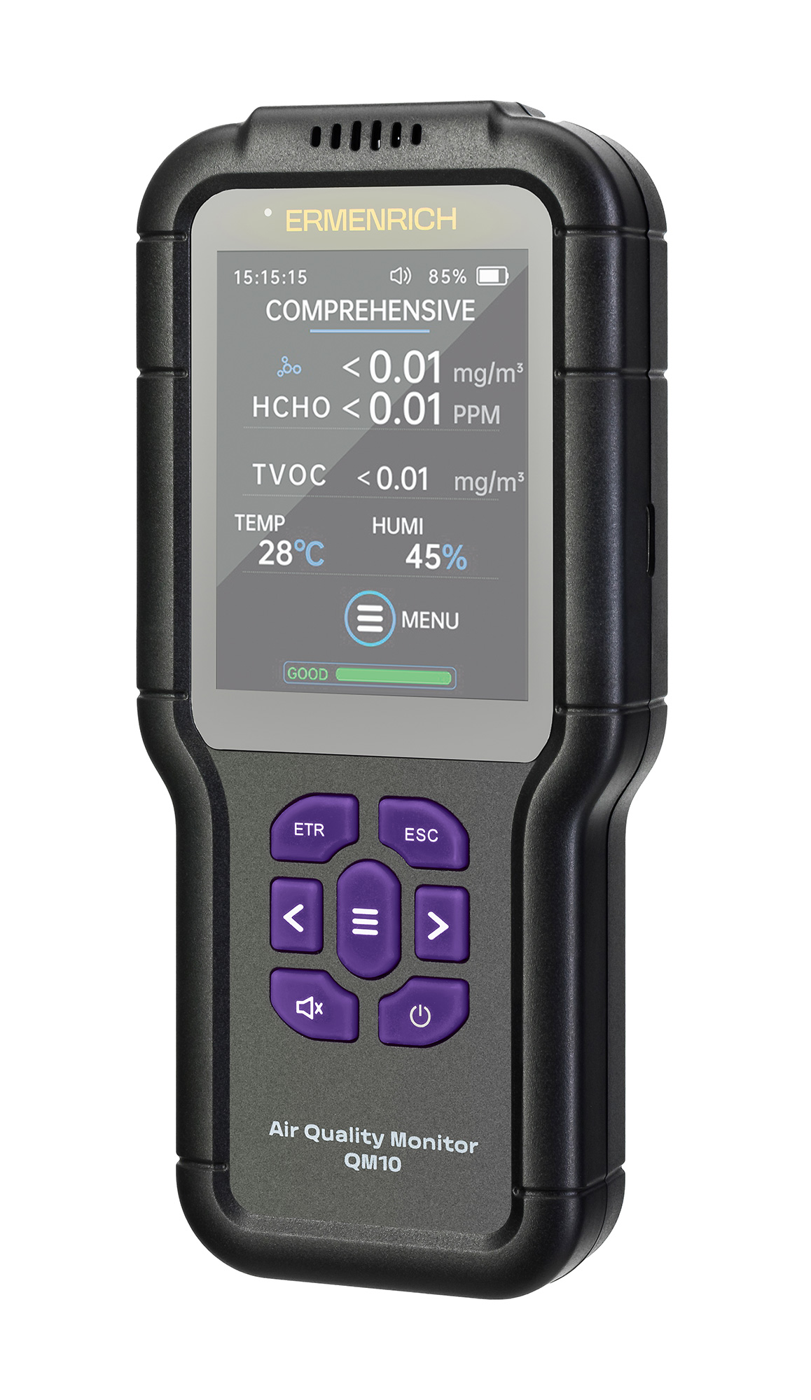 El medidor de calidad del aire Ermenrich QM10 es un instrumento portátil para analizar la composición del aire interior, detectar niveles elevados de sustancias nocivas y controlar el microclima. Se puede utilizar en entornos domésticos y comerciales (oficinas, hoteles, escuelas y guarderías, cafeterías, tiendas, etc.), pero no para fines industriales, ya que el intervalo de medición de TVOC (comp